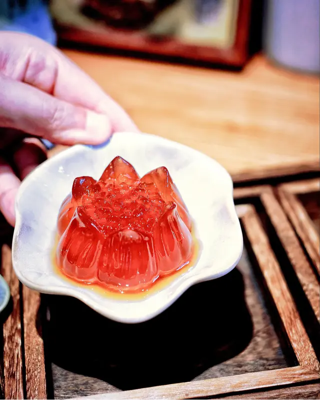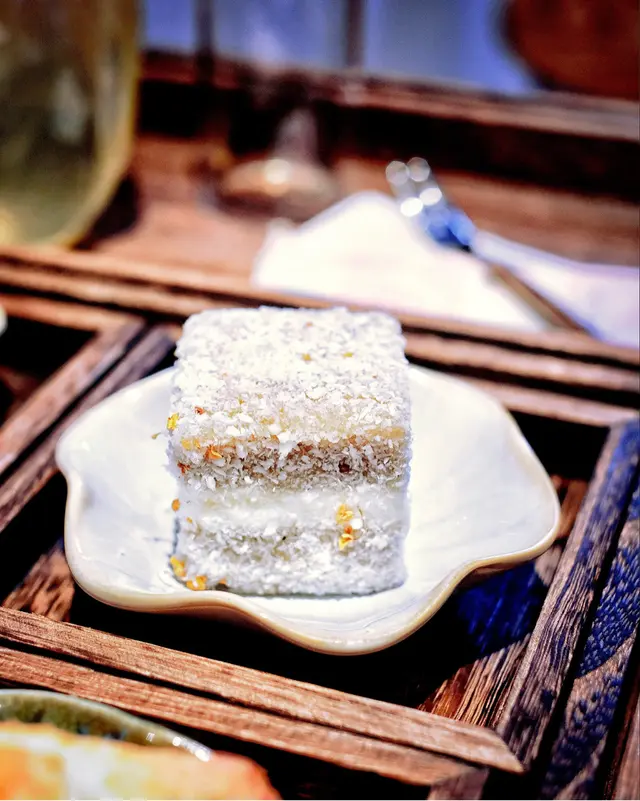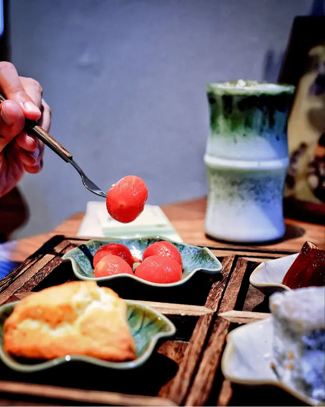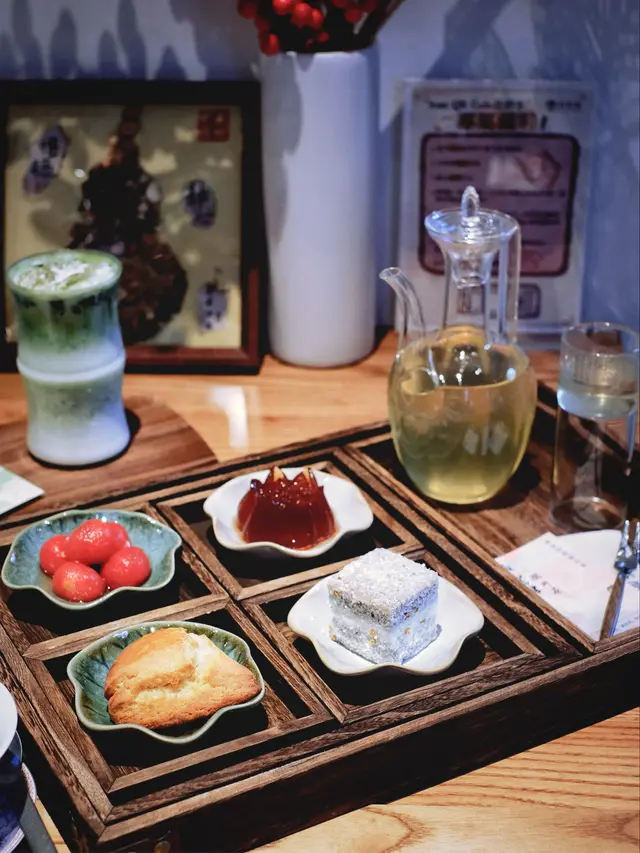 四宮格的甜點如同城市裡的微光,小巧甜蜜如芒果朱莉林蛋糕的椰絲香,還有紅豆抹茶餅那抹不去的茶韻。每一口都是東方美學的細膩綻放,也讓味覺故事漸漸展開。