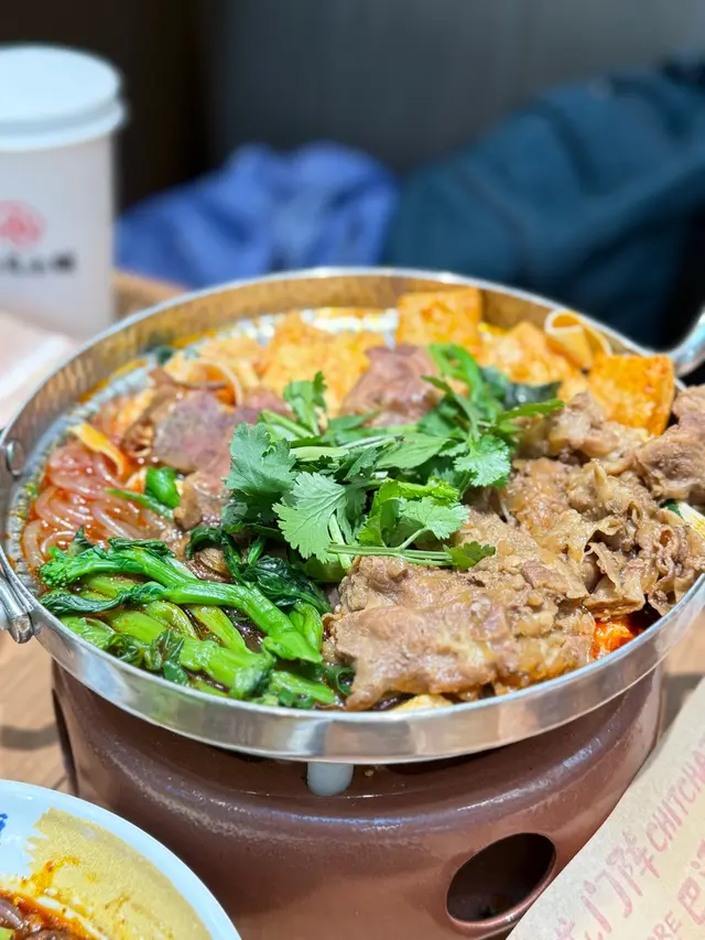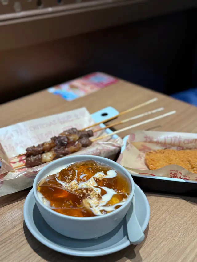 之後朋友就叫左一個醬香滷牛肉小鍋冒菜,作為食肉獸的他即刻加多一份肥牛,一路食一路下面還在熱住,可以放心慢慢食;滷牛肉很香,配搭湯汁一齊就是下飯神器,而且加的肥牛份量也很多,再埋上這麼多的配菜(有豆乾、薯粉這些)兩個人食也綽綽有餘,然後還加了一份琥珀冰粉和香嫩牛肉串