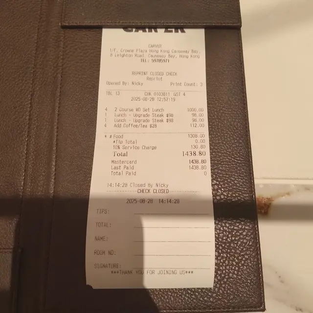 總括嚟講,CARVER呢個Weekday Set Lunch絕對係物超所值。 以唔使三百蚊嘅價錢,喺銅鑼灣嘅星級酒店入面,享受到環境、服務同埋有相當水準嘅三道菜,性價比極高。菜式唔係一味靠「行貨」交功課,無論係頭盤嘅創意定係主菜嘅功架,都食得出廚師團隊嘅心機。如果你想喺平日搵個地方,同朋友或同事食返餐好啲,又唔想太破費,CARVER絕對係一個值得推薦嘅選擇。下次我會想試吓佢哋聞名嘅熟成牛扒,睇吓晚市係咪有更大驚喜!