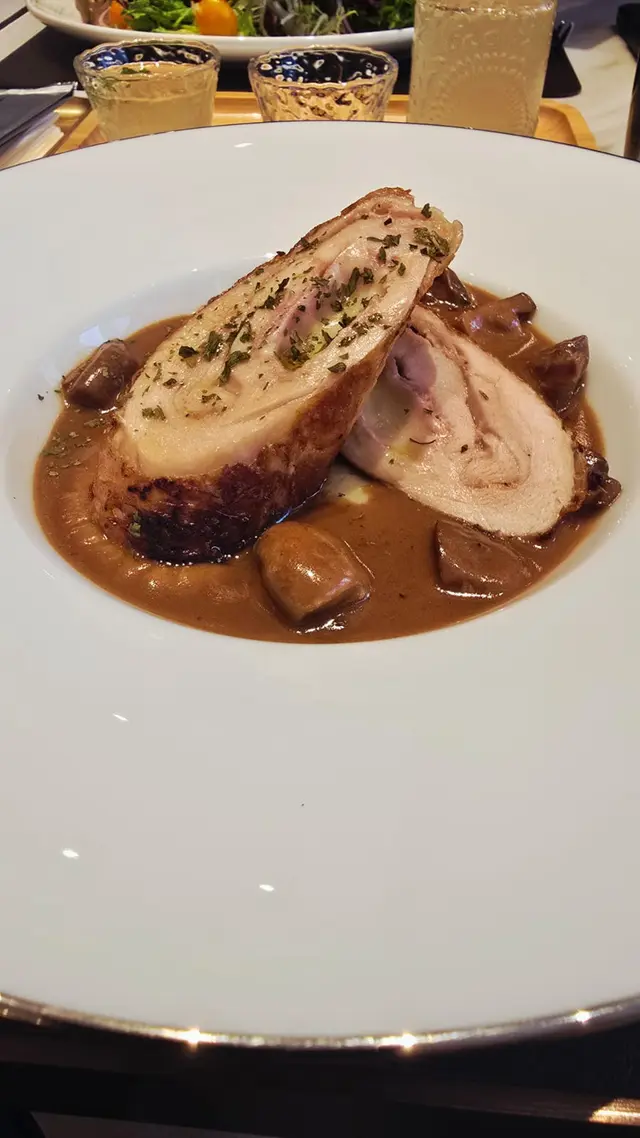 主菜一上枱,賣相已經好吸引。雞卷外皮焗到金黃色,切開之後,見到裡面嘅火腿同半溶嘅水牛芝士,非常誘人。雞肉保持到嫩滑多汁,一啲都唔嚡口,證明火候控制得好好。旁邊嘅黑松露薯蓉打得非常幼滑,松露味香濃,但又唔會霸道到搶走雞肉嘅味道。個伊雲士汁(Jus)亦都調得唔錯,濃郁得嚟唔會太鹹,同雞卷、薯蓉一齊食,味道非常夾。