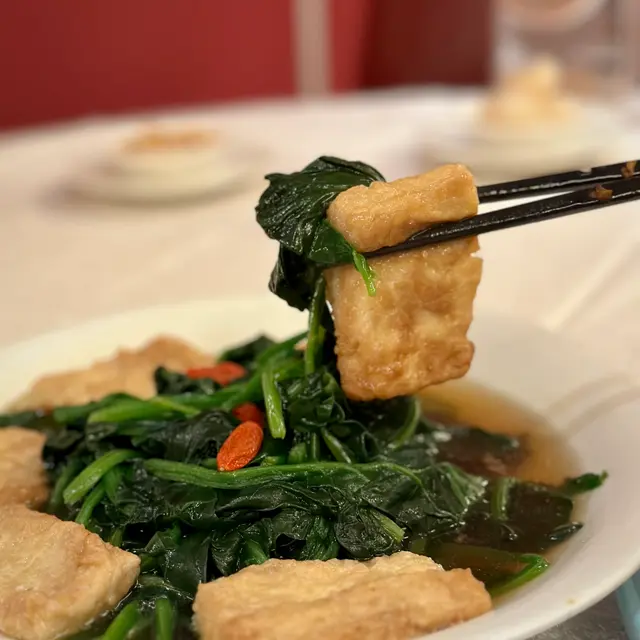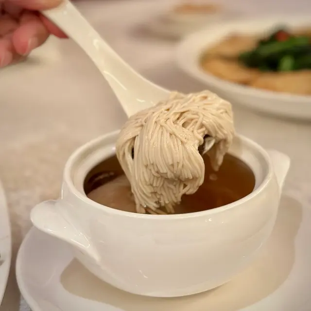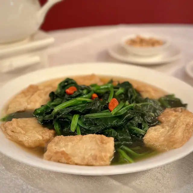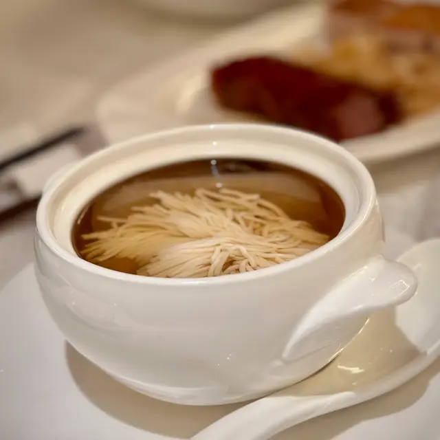 湯色清澈見底,入口卻蘊藏深厚底蘊。湯質醇而不濁,特別的是湯中浮沉如花的食材——以豆腐雕刻的花朵,在清湯中舒展,不僅展現刀工,更讓湯汁帶著淡淡清甜。這道湯品是對粵菜「清中求鮮」的完美詮釋。
