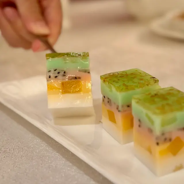 收尾的甜點令人驚喜。五色糕實為五層,以椰汁、芝麻、桂花等天然食材層層相疊,質感細密柔滑。桂花清香與椰香交織,甜度克制,餘韻淡雅。