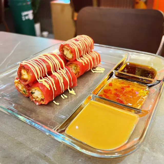 滑滑嘅外皮包住脆脆内層,而脆脆內層又有鮮甜嘅蝦,口感相當豐富,再配上三款特制醬汁,真係直得一試。