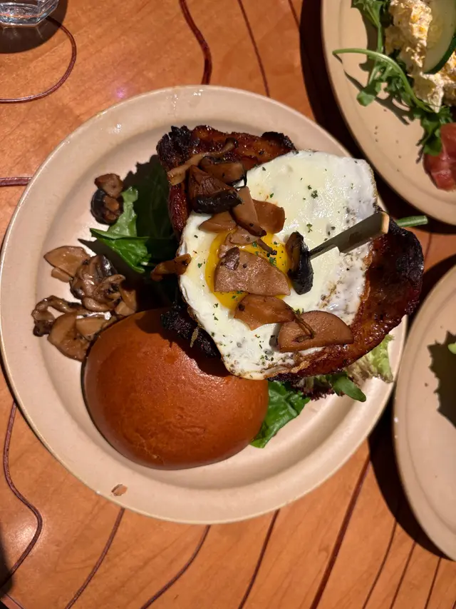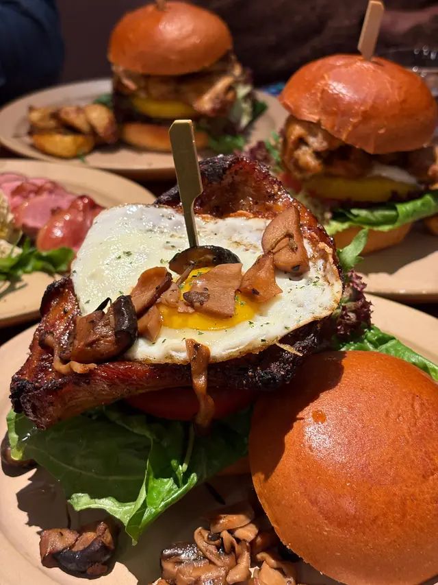 厚切豬頸肉先煎後烤出琥珀焦紋,咬下瞬間「咔滋」脆響伴隨肉汁噴發!🍖 野菌炒至鑊氣飄香,淋上自製松露芥末籽醬,疊加流心太陽蛋後——刀叉輕壓即見金黃岩漿漫過肉山🌋 附餐薯條撒滿帕瑪森起司粉,邪惡指數破表!