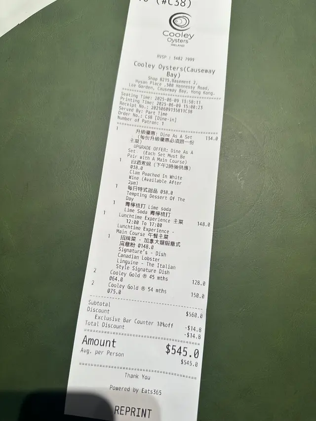 呢度精選多款生蠔,有36、45、54同60個月不同育成期可揀,價錢由$55起。鍾意飲酒人士不妨叫杯白酒襯托一吓,除可提升生蠔鮮甜味外,生蠔更有6折優惠,即一隻都唔使$33,抵食!