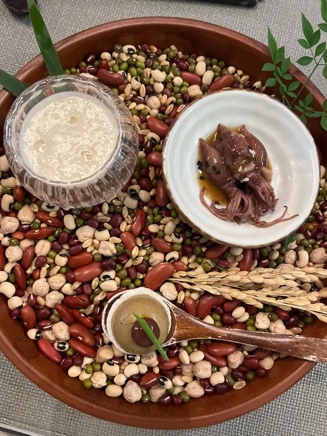 Starter好精緻!有酸酸地開胃既瑩光魷魚, 匙羹上面鵝肝味超重既moses 同埋 日本里芋暖湯