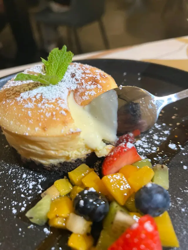 必食嘅甜品,預返約15-20mins時間焗製,切開蛋糕嘅流心令人驚喜,芝士蛋糕香濃好味道,有大量鮮果伴碟,蛋糕與水果一齊食更好味。