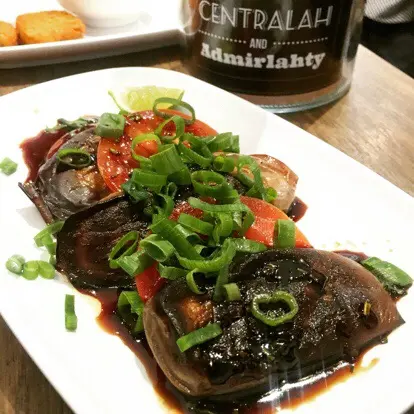 都等咗一陣,先上個冷茄子沙律,黑色一片片,原來係燒茄子黎嫁,青蔥,莞茜純裝飾用,而所謂嘅鮮青檸醬柚汁?我真係一啲都食唔到,我食到嘅只係一舊舊淋咗嘅黑茄子配上一啲好甜嘅不知名黑色醬汁⋯⋯