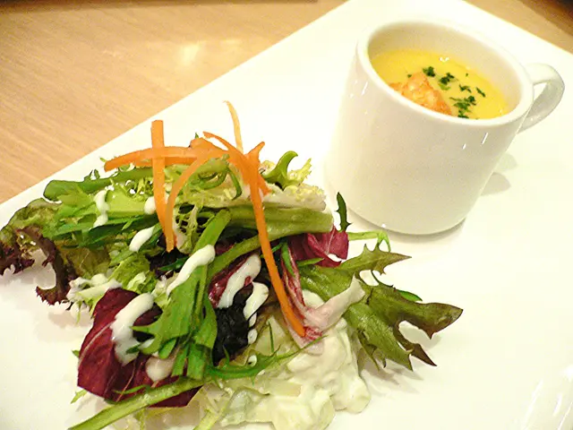 首先來的甘筍湯,細細杯,味道香濃,夠熱;伴沙律;一清一濃,很好味。