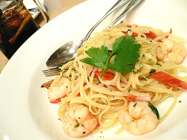 另一主菜:橄欖油大蝦炒扁意粉,蝦肉十分新鮮彈牙,咸淡適中又不太油。