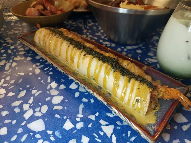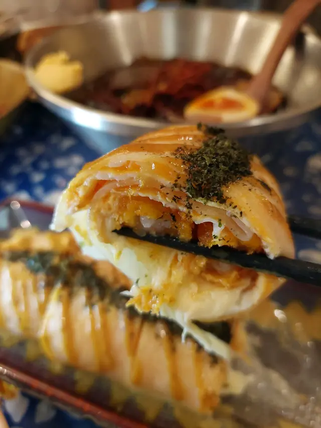 蛋餅我食得多,層次感豐富材料咁充足嘅都係比較少見。蛋餅裡面加咗天婦羅蝦 ,滿滿嘅芝士拉絲 ,腸粉形狀嘅蛋餅, 切開一小段一小段容易夾, 面頭的紫蘇葉碎, 同蛋餅好襯。 提提你:咖哩味反而不太濃,所以碟邊伴有少少咖哩汁,悉隨專便。