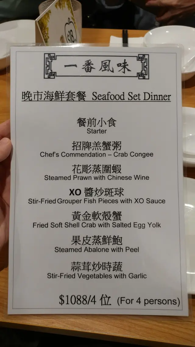我地7點未夠已到餐廳, 客人未算好多, 不過7點後就開始多人, 餐廳裝修簡潔明亮, 座位寬敞, 4人卡座尤其舒適。餐牌設計簡單, 不過款式種類都唔少, 當中最吸引係4位用嘅晚市海鮮套餐, $988包括羔蟹粥, 蝦, 鮑魚, 軟殼蟹同斑球, 價錢相當貼地。👍
