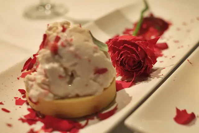 最後把玫瑰花也用 liquid nitrogen 冷凍,再辣手催花把花瓣搓碎洒在雪糕上和碟上。