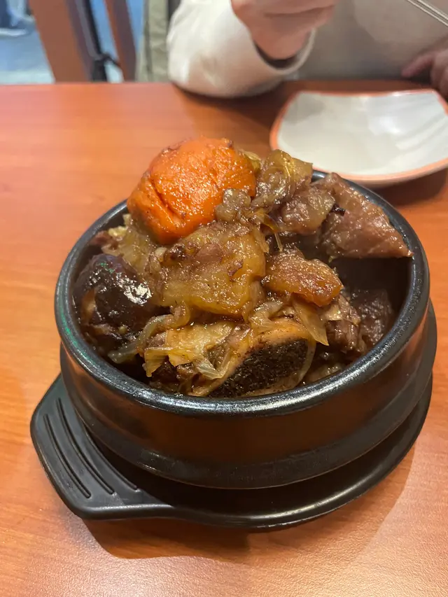 類似韓式味噌湯,有豆,兩隻蜆,一隻新鮮嘅蝦。其他配料有薯仔片,豆腐,好足料。足料得來又唔會霸曬個湯,唔係好辣,有跟飯,冬天食反碗好適合。
