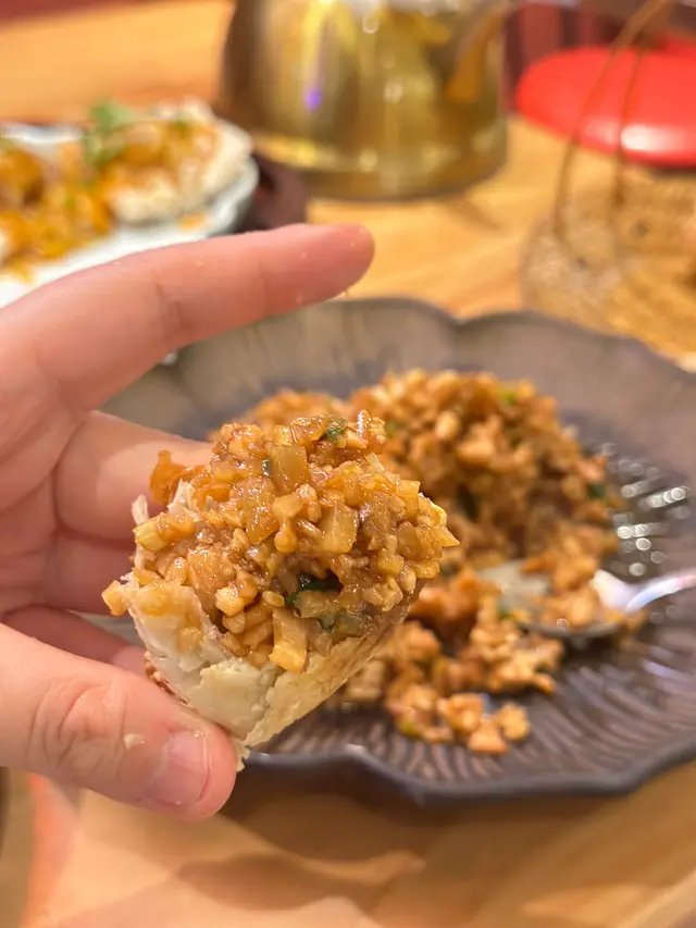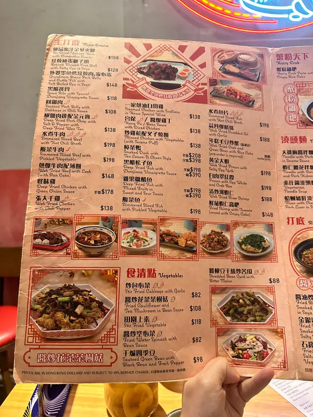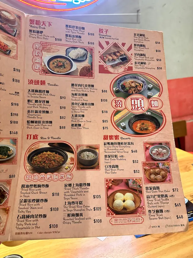 「炒雞菘配叉子燒餅」餡料多,適合多人食,最後餡料多到要takeaway。秋季限定「蟹皇玉帶拌鍋巴」帶子好厚肉,煮得啱啱好,好嫩口,可惜蟹黃醬偏鹹,食完少口渴。