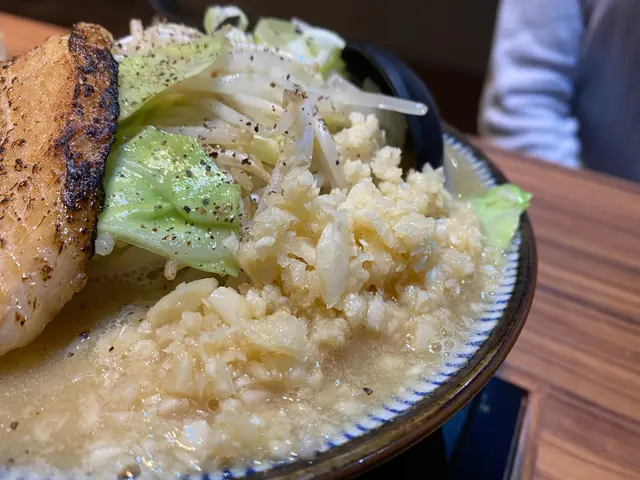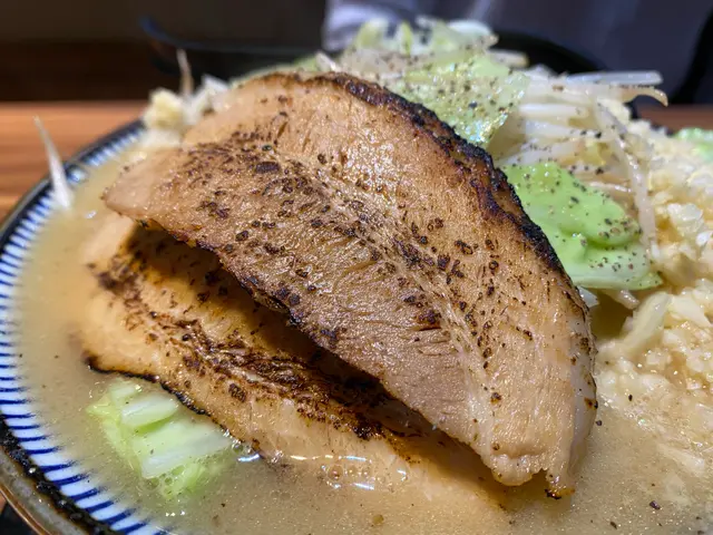 另一客點了野菜山拉麵,有大量的野菜,風味與豚骨沾麵截然不同,滿滿的野菜充滿了清爽的口感,加上極大量的新鮮蒜泥濃郁香醇的滋味,而炙燒過的日式叉燒,肥瘦比例適中,帶有濃郁的炭烤焦香,各種材料之間平衡恰當,不會彼此掩蓋味道,反而能調和到一起。
