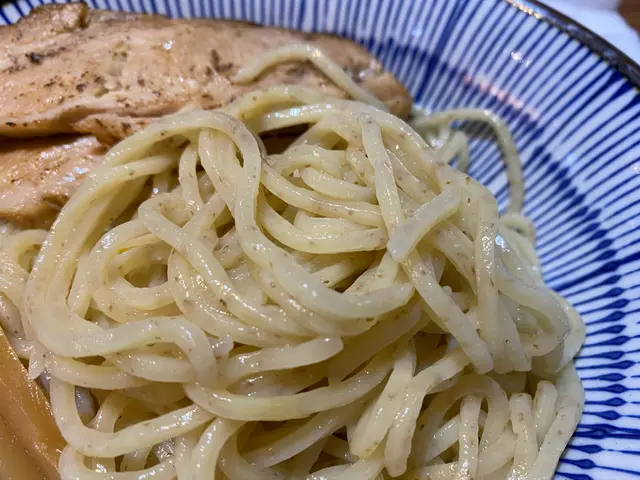 先點一客招牌的豚骨沾麵,吃沾麵習慣先品嘗麵條本身的味道及口感,口感筋道醇厚,頗有嚼勁,富小麥香味,而後味甘甜。接下來把麵條放入豚骨湯底中,把上面的魚介混入湯底,入口醇厚香濃,實屬上品!另外一提,半熟味玉蛋黃相當濃郁。