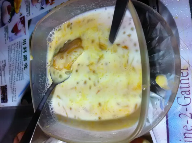 先說賣相,與其說是楊枝金露,倒不如稱之為芒果椰汁西米露更為貼切。白色汁液中盡是西米,上面淋了些芒果醬和少許柚子肉。