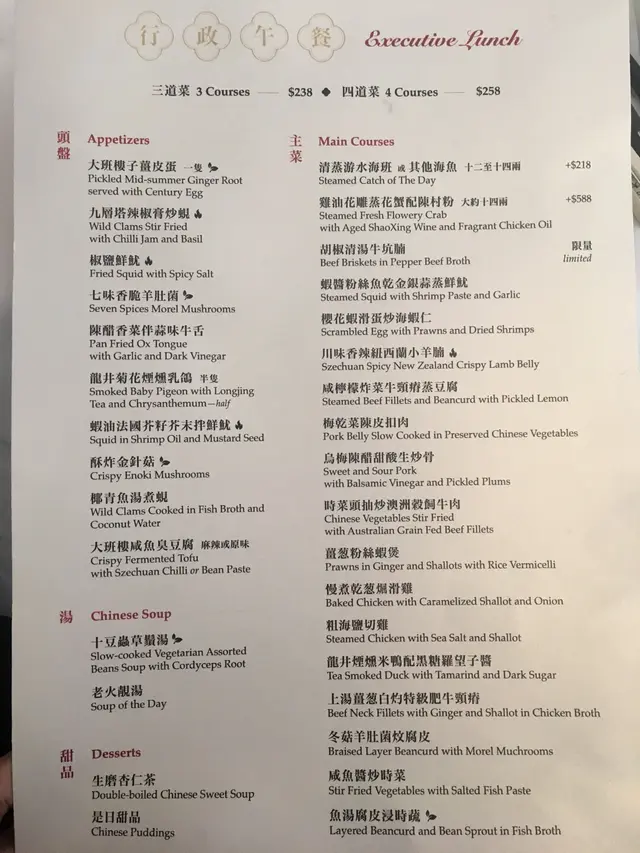 行政午餐能同時滿足不同願望,可選三道菜或四道菜,五至六人同行已能品嚐餐牌中大部份出名菜式