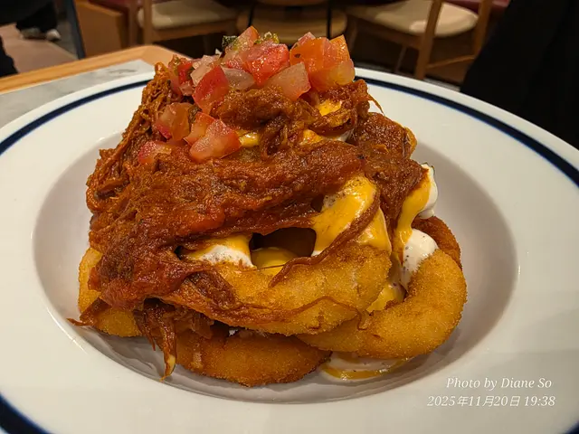 用慢煮手撕豬肉甜甜地帶點肉汁,配埋炸洋蔥圈加埋大量芝士醬,沙律醬同蕃茄SASA,效果似墨西哥Taco's 好鐘意平凡洋蔥圈變得不平凡,有層次。