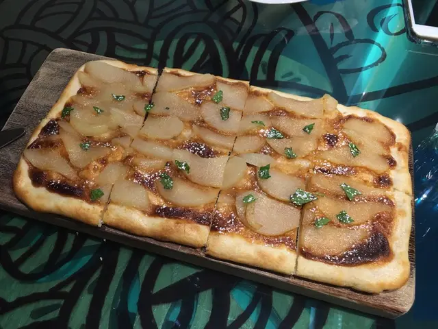 白酒煮梨薄餅是一款甜味薄餅,有感吃得差不多,是時候叫一些甜點,就選擇了看來很有趣的甜薄餅了,亦因為胃已填得差不多,特地點了一客小的,誰知道端上來是6"x12"長方型的大小...跟很好人的侍應姐姐打趣說會不會送錯了呀? 她笑笑口說這就是小的了,中型的可是12"x12"正方的呢! 我不敢再問大的又多大......梨子煮得香甜,柔軟,亦不會被焗爐帶走水分,底下鋪了煉奶,兩者加起來有一點兒膩,所以又灑了切碎的薄荷葉在上面,整體不太甜,薄餅皮則不算煙韌,反倒是麵粉香仍在,不算差了。