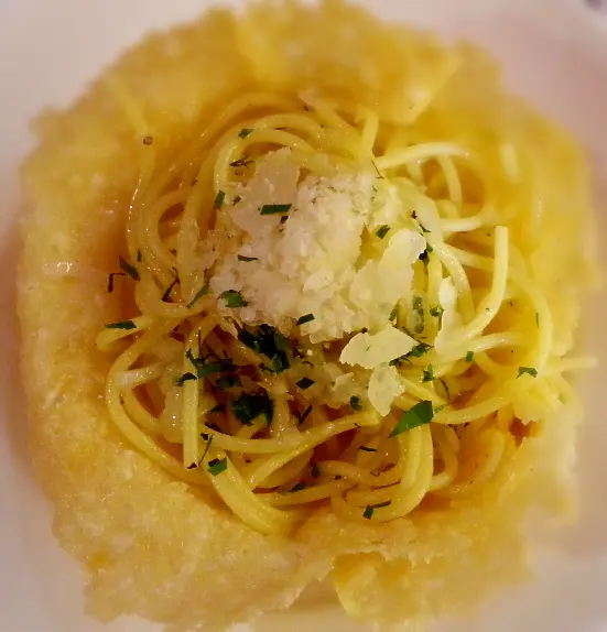 The pasta is not served in a creamy cheese sauce as I expected. Instead, it was fried with olive oil, onions, garlic and herbs, and then served in a bowl-like crust which was made of goat cheese.
