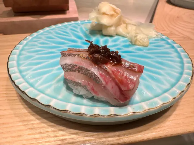 鱆紅魚壽司配上味噌醬: 鱆紅魚又名黑鯛,味噌醬能增添鹹鮮滋味呢個配搭增加壽司,層次感👍