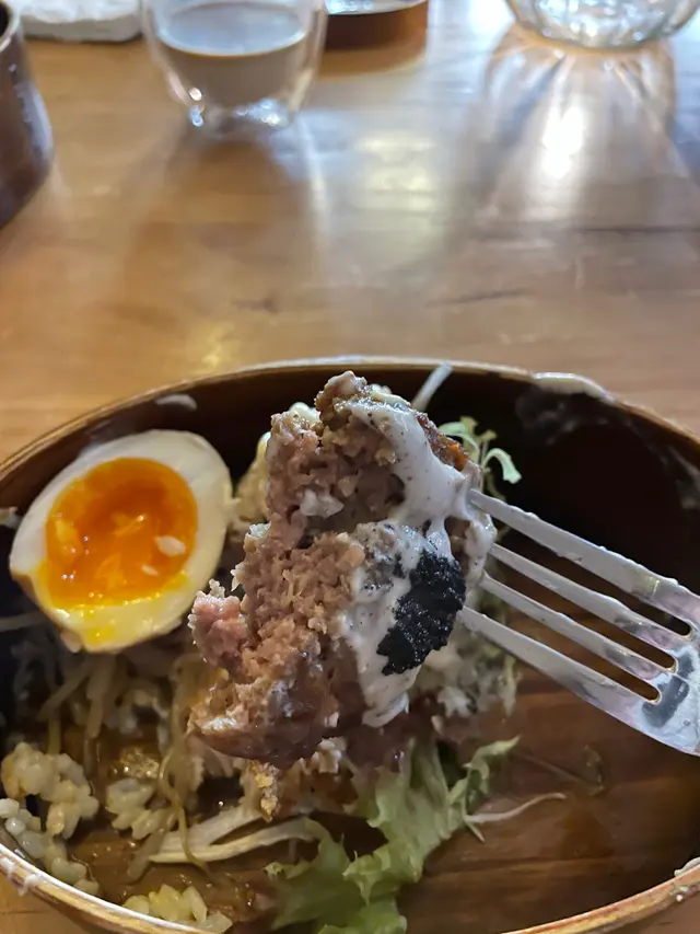 便當入邊有兩大塊嘅漢堡、兩舊飯團、半隻糖心蛋同埋一啲涼菜。漢堡扒表面加咗好多黑松露,配上本身漢堡扒嘅牛味就更加香啦,不過唔知係咪便當關係,漢堡扒係暖暖哋,唔會太熱。飯團分別有三文魚蓉味同醬油味。我覺得三文魚蓉味幾好味,撈埋啲沙律醬好食🤤。至於醬油味,朋友覺得比較寡,因為飯團淨係有紫菜碎同醬油,不過我自己認為醬油味夠,清清地幾好食。另外,涼菜有一啲麻油芽菜同麻辣青瓜,幾辣咖,咁可以配返嗰兩舊飯團食,咁就啱啱好啦😝