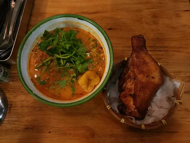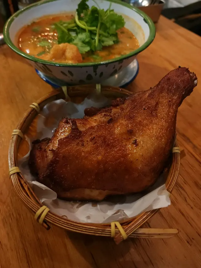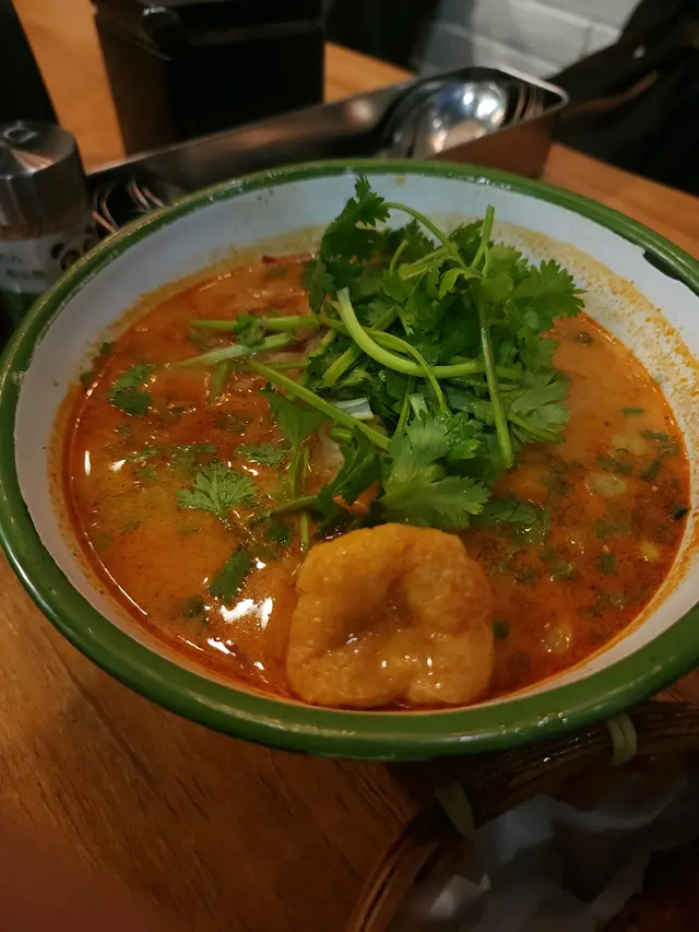 黎呢度當然要叫佢地signature雞脾冬蔭公湯粉 冬蔭公湯底酸辣度啱啱好 有粟米仔 魚片 炸雞脾好大隻…即叫即炸 皮脆…切開仲有好多肉汁