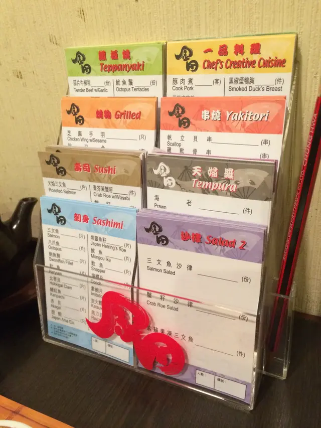 壽司、鐵板燒、串燒、一品料理、天婦羅、沙律。