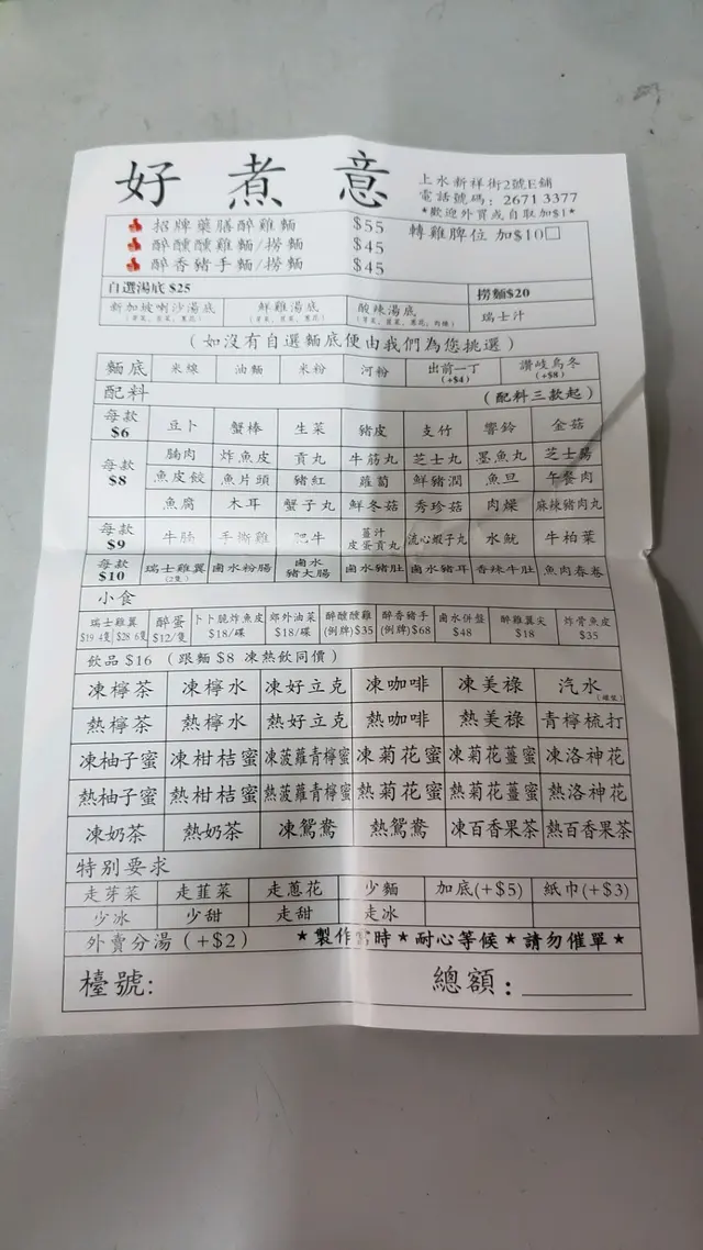 下次唔好食車仔 SunshooterLevel 22022-03-16481 views Follow 疫情下好多餐廳都唔做堂食,前幾日行過呢間舖,好耐冇食過,所以幫襯個外賣。我選了鹵水豬大腸,腩肉同魚腐,河粉加底,連外賣盒要$58,我要承認只留意"至少三餸",冇留意個基本底已經要$25,所以侍應大姐講$58,我呆了數秒,但冇所謂,好食就可以。返到公司打開個盒,係塞滿的,不過整體幾失望,最大問題係鹵水豬大腸你只係比幾小粒!?唔係咁矜貴掛~ 其他好普通。幫佢兜的話,唯有話我自己冇加多$2分湯,搞到佢地整得唔好囉。又或者佢專長係藥饍雞,而我冇幫襯囉~2The above review is the personal opinion of a user which does not represent OpenRice's point of view.LikeShare下次唔好食車仔 好煮意 https://s.openrice.com/QrKT0UJj200Report Post Ratings2Taste2Decor3Service2Hygiene1ValueDate of Visit2022-03-14Waiting Time10 Minutes (TakeAway)Spending Per Head$60 (Lunch)