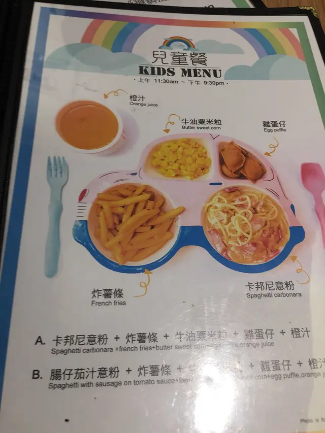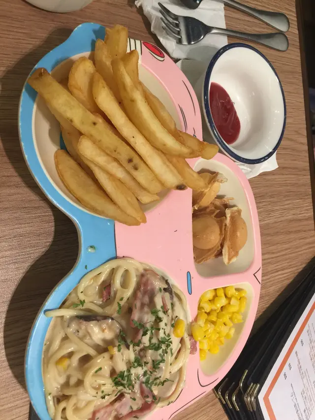 食物好快送上,兒童餐的確幾足份量,有一碗卡邦尼意粉,炸薯條,牛油粟米、橙汁!最特別係有幾粒雞蛋仔,雞蛋仔同薯條都幾好食,點解我的知,因為我偷食左D!