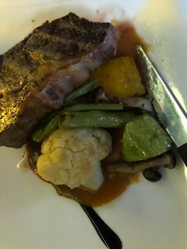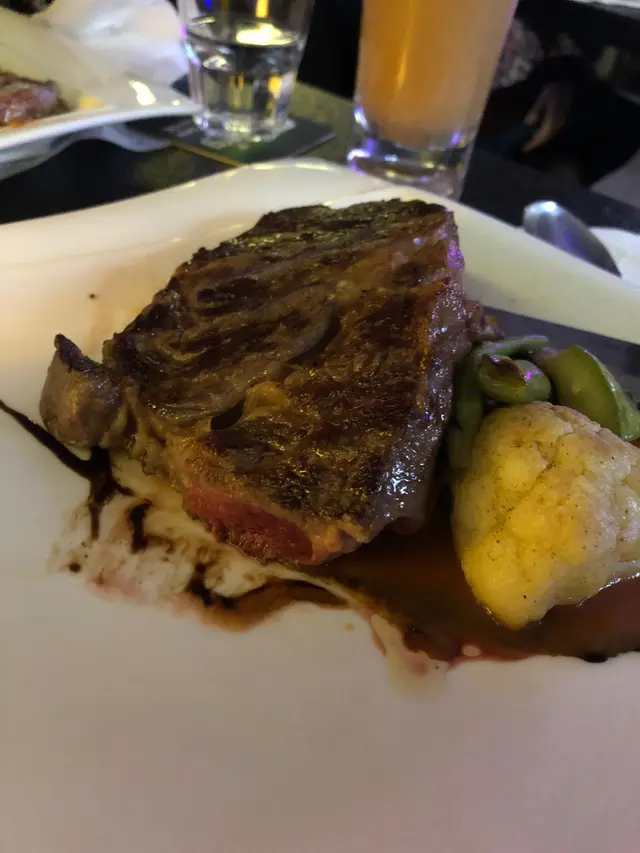 重頭戲既牛肉擺盤擺得好靚,一個跟蒜蓉汁一個跟燒汁,兩件牛都係十分重牛味!煎得唔乾,食到心心眼,肉眼夠厚所以見到中間紅卜卜仲有血水,可惜既係西冷因為太薄叫五成熟其實已經差唔多熟哂了。我地本身想一個跟意粉,但估唔到兩個跟薯菜都夠飽。
