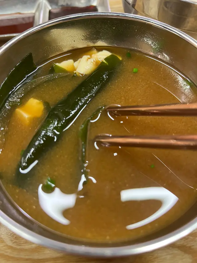 面豉湯都幾足料,唔知係咪工作人員太忙或根本沒有水供應,因唉了兩次都沒給水杯,可能真係要付錢點飲品才得,我見熱茶要$5杯,如果可以做到日本咁,有凍水任斟會好些。