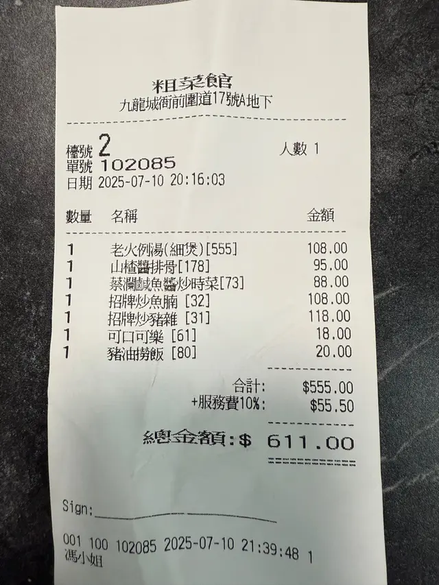 不平凡的粗茶淡飯 A姐M佬Level 42025-07-13272 views Follow 位於九龍城嘅粗菜館,係區內主打粵菜嘅老字號,深受明星、甚至食家推薦,絕對係名人飯堂!今日慕名而來,粗菜館價錢唔離地,出品高質細緻,雖然餐廳以「粗」字命名,但絕對係為你帶嚟驚喜,是絕不平凡的粗茶淡飯。老火例湯今日嘅老火例湯係青紅蘿蔔煲豬骨,餐廳用料十足,非常足料,味道清甜。山楂醬排骨略帶酸甜的山楂醬緊緊包裹著肥瘦適中的排骨,非常開胃。招牌炒魚腩魚腩預先走油,令到魚皮咬落鬆脆,但魚肉仍然保持嫩滑;而配菜的蒜片、大蔥等都是不可忽視的,將魚腩夾上蒜片和蔥段一齊吃,增加味道層次。招牌炒豬雜豬雜清洗得非常乾淨,將內臟嘅腥臭味一洗已去。而豬雜炒得夠火候,口感爽口,係粗菜館嘅招牌菜之一!豬油撈飯懷舊嘅豬油撈飯令白飯充滿豬油嘅香味,加上香濃嘅醬油,雖然邪惡,但真係充滿港式風味。The above review is the personal opinion of a user which does not represent OpenRice's point of view.LikeShare粗菜館 https://s.openrice.com/QrKT0ypQkW0Report Post Ratings5Taste4Decor5Service5Hygiene4ValueDining MethodDine In