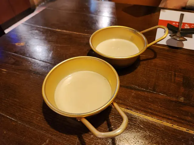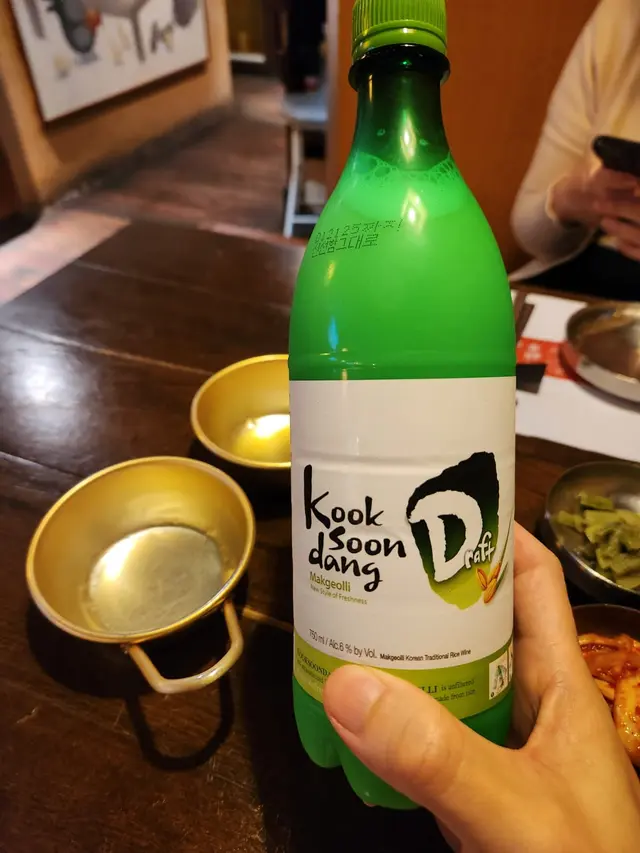 我們還點了一支米酒。老實說我也是第一次試韓國米酒。職員放下了小碗給我們喝酒用,原來用碗飲米酒是韓國人的傳統!這米酒是從前韓國工人農夫等休息時的飲料。米酒有一半是米漿,飲用前要搖勻。倒出來的米酒微微杰身,散發著淡淡的米香味。