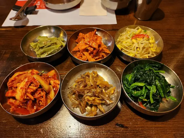 我們人不多,點了個辣明太魚鍋和芝士泡菜石頭飯。點菜後很快就嚟左六碟前菜,職員話係佢地自家製的。我尤其喜愛小魚乾。小魚乾明顯比平時一般常見的小魚乾大,而且加入了合桃和甜甜的醬汁,特別美味!