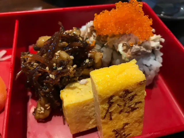我點咗德美刺身壽司便當, 最先上嘅係miso soup同沙律菜, 平平無奇. 再來茶碗蒸, 白果香味重, 蛋質滑溜入口即溶.