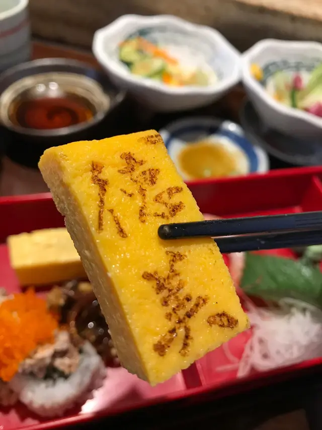 而同事嗰個係壽司定食配牛肉細烏冬, 個招牌德美玉子燒好搶眼呀! 望落啲牛肉片肥同肉平均, 應該幾正. 呢個set有壽司又有暖暖嘅烏冬熱食, 下次試呢個.