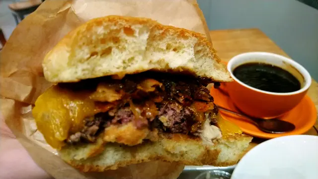 點了一個 Bacon Bomb burger, 放在burger的餐牌第一行, 應該係最代表性嘅。 配有小食或沙律, 揀選咗沙律配黑醋汁, 加多個熱咖啡。 付款後隨即在鄰近的咖啡機等候, 熱咖啡即刻炮製, 兩至三分鐘便有得取貨。