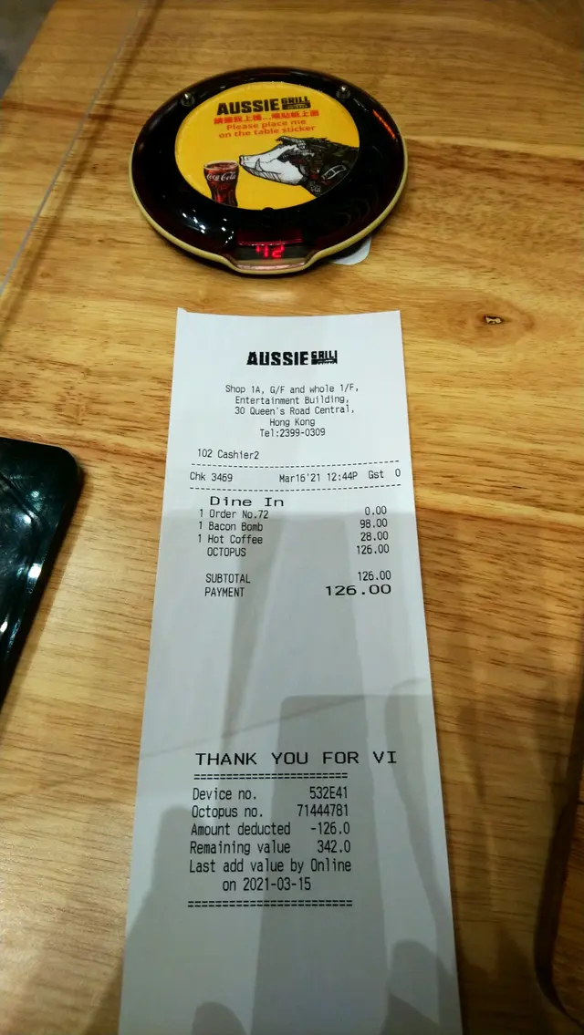 搵到位後隨即放上電子感應位置, 一分鐘之內漢堡包都有專人送到, 比想像中快好多, 可惜沙律畀錯咗汁, 都唔緊要, 因為都好好味, 啲沙律菜夠新鮮。 個包就普通咗啲, 內有兩片bacon及很多的bacon碎。 杯咖啡就好得, 雖然食完個包,飲的時候已經不會太熱, 但見到咖啡泡分解後, 有一層咖啡油在面, 酸道適中, 咖啡豆烤味濃郁, 香味充足!