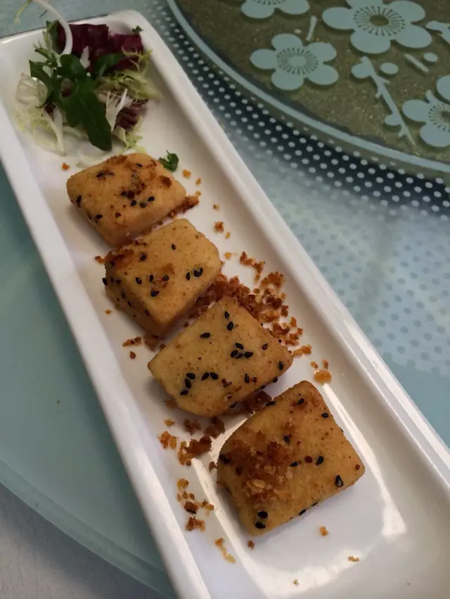 金磚豆腐,外脆內軟,吃時要小心,內面熱得很,點下喼汁,可中和下熱氣,更覺可口。