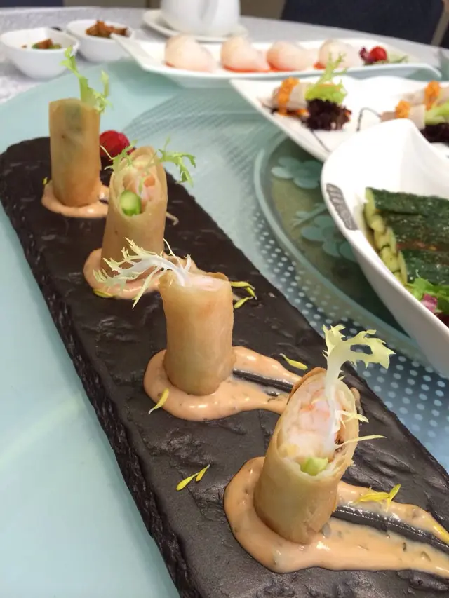 春卷又有虾,春卷皮薄,炸得很鬆化,加上有些沙津醬令其感覺不太熱氣且醒胃。更有菜蔬放上當裝飾。視覺上更加有層次。