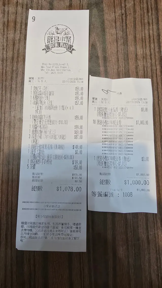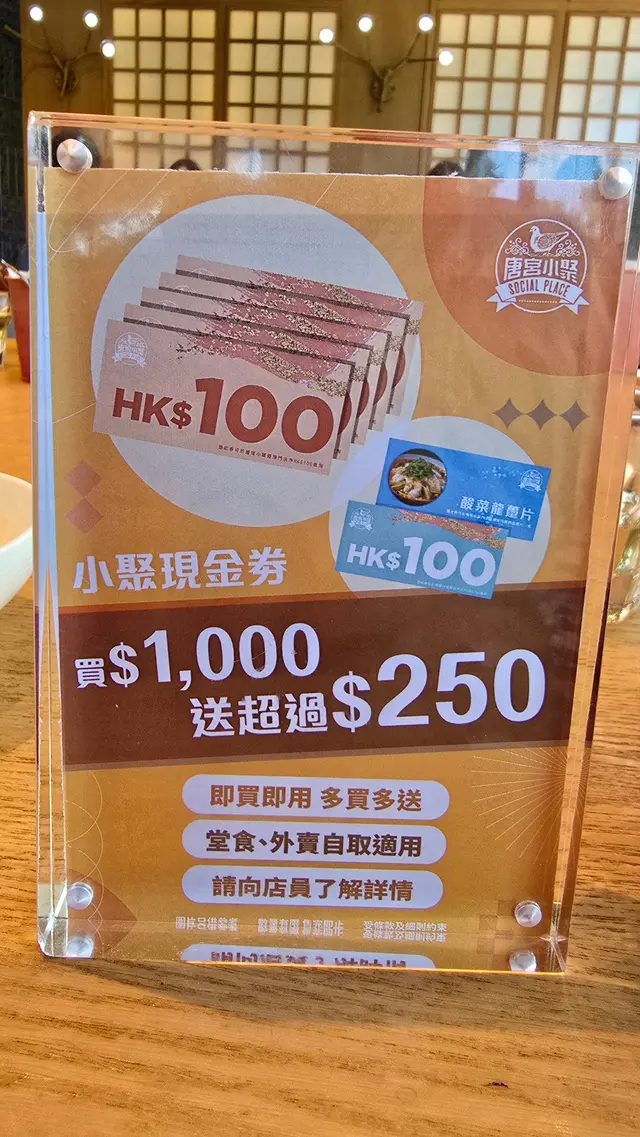 優惠一:買咗一千蚊現金券 ,送多一張100蚊現金券和鹹菜龍躉片一客, 100蚊現金券和鹹菜龍躉片一客,要待下次使用。