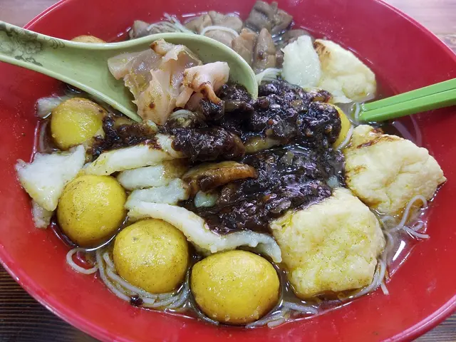 ※ 米粉配豬大腸、辣魚蛋、豆卜、魷魚及魚肉 加辣汁 ~ 這是我點的五餸米粉,他們用了較大的碗子盛載了。 環顧左右,其他食客是用標準碗子盛載麵食,我很大食嗎