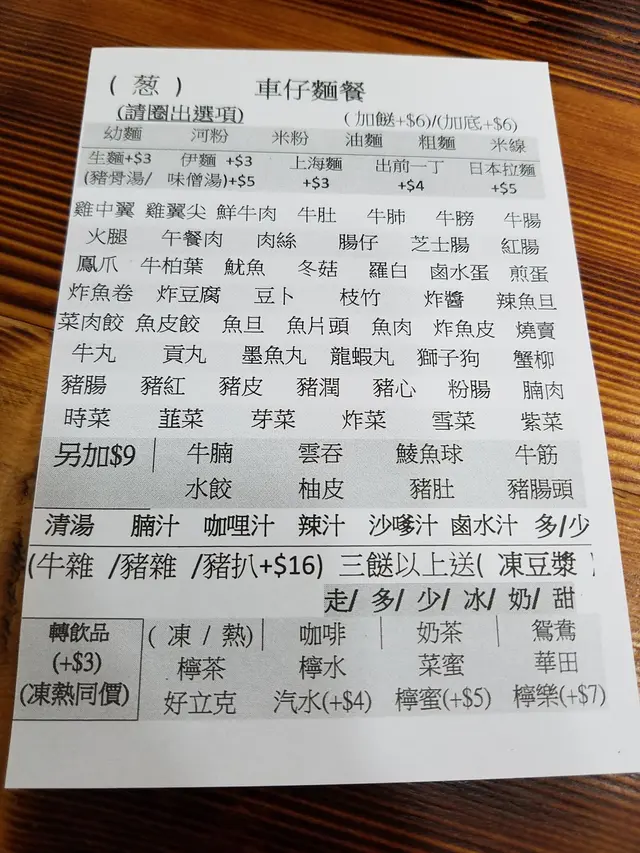 而小店以車仔麵食為主打,因為在半開房式小廚房上貼了大大張的車仔麵餐牌。無論是醬汁、配料、配菜及粉麵類也有很多選擇。 在每張枱上也有車仔麵點菜單供客人自選, 只要把所有想吃的都圈起來然後交給店員即可。