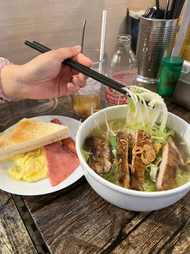 💛南洋特式常餐:選了豬扒米粉,配特飲龍眼冰👍🏻常餐跟炒蛋、香腸,火腿及多士。