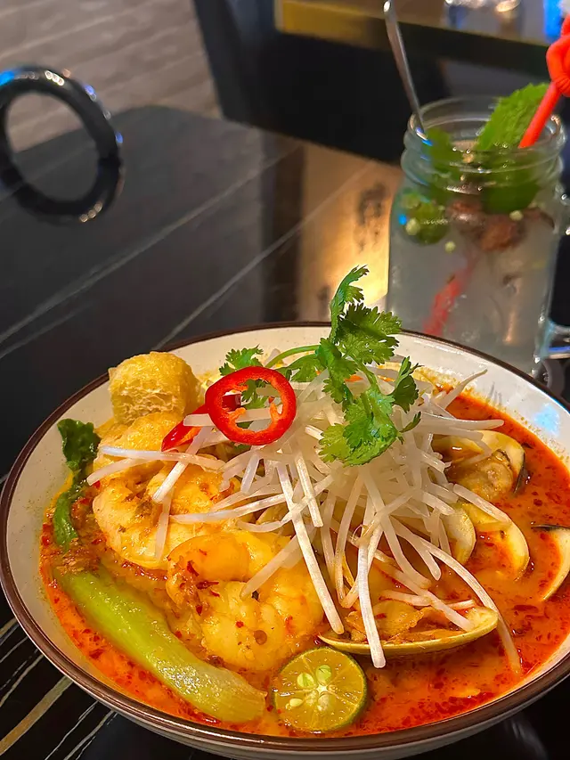 海蝦和大蜆都好新鮮!叻沙湯底微辣,很好吃。