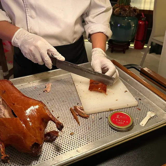 🪿魚籽醬烤鴨配煎餅 鴨皮酥脆、肉質鮮嫩,魚籽醬嘅鹹鮮同鴨嘅香氣完美融合,煎餅薄軟有韌性,整體口感層次豐富,奢華而不失傳統風味