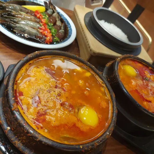 <醬油蝦set 配部隊豆腐鍋>😋 ~ ($198}~ 醬油蝦大大蝦鮮甜爽彈, 部隊鍋就梗係正啦, 再加埋一鍋熱辣辣既白飯👍